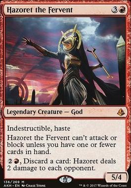 - If you are playing a burn deck, you will often find yourself with no cards in hand. This plays well with Hazoret as it needs you to have at most one card in your hand for it to be activated.